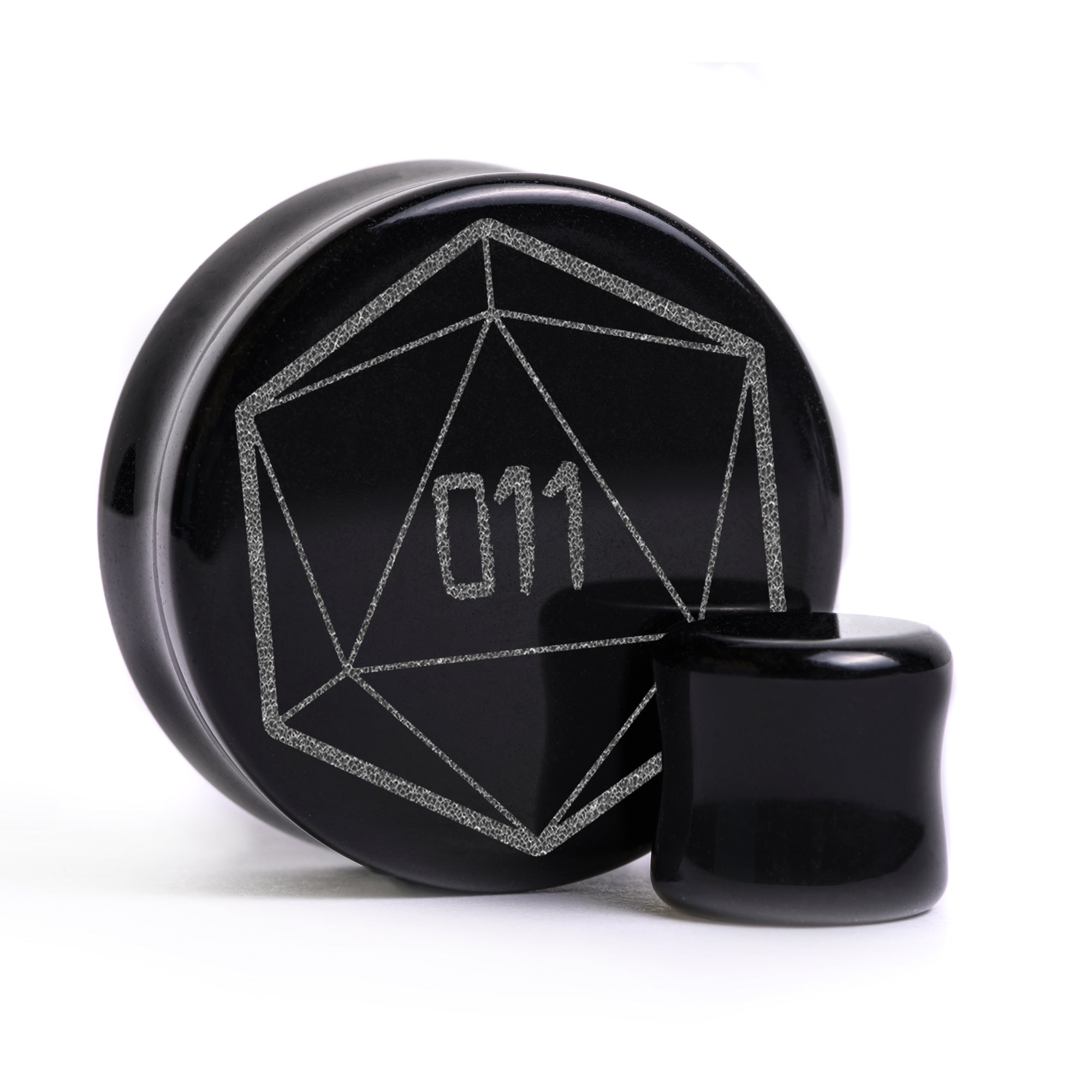 Flat Faced Doubleflared Black Glass Plugs featuring our laser engraved “Eleven Dice'' design.