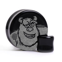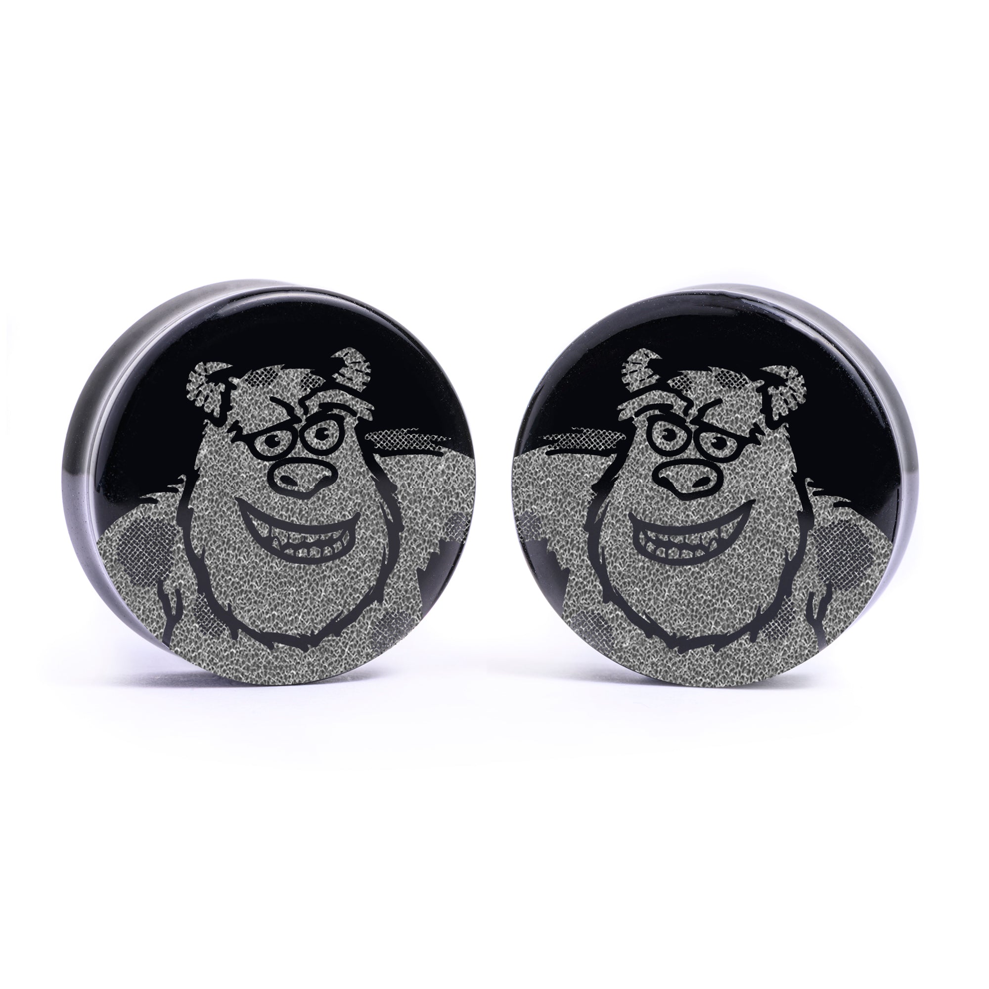 Flat Faced Doubleflared Black Glass Plugs featuring laser engraved "Sully" design.