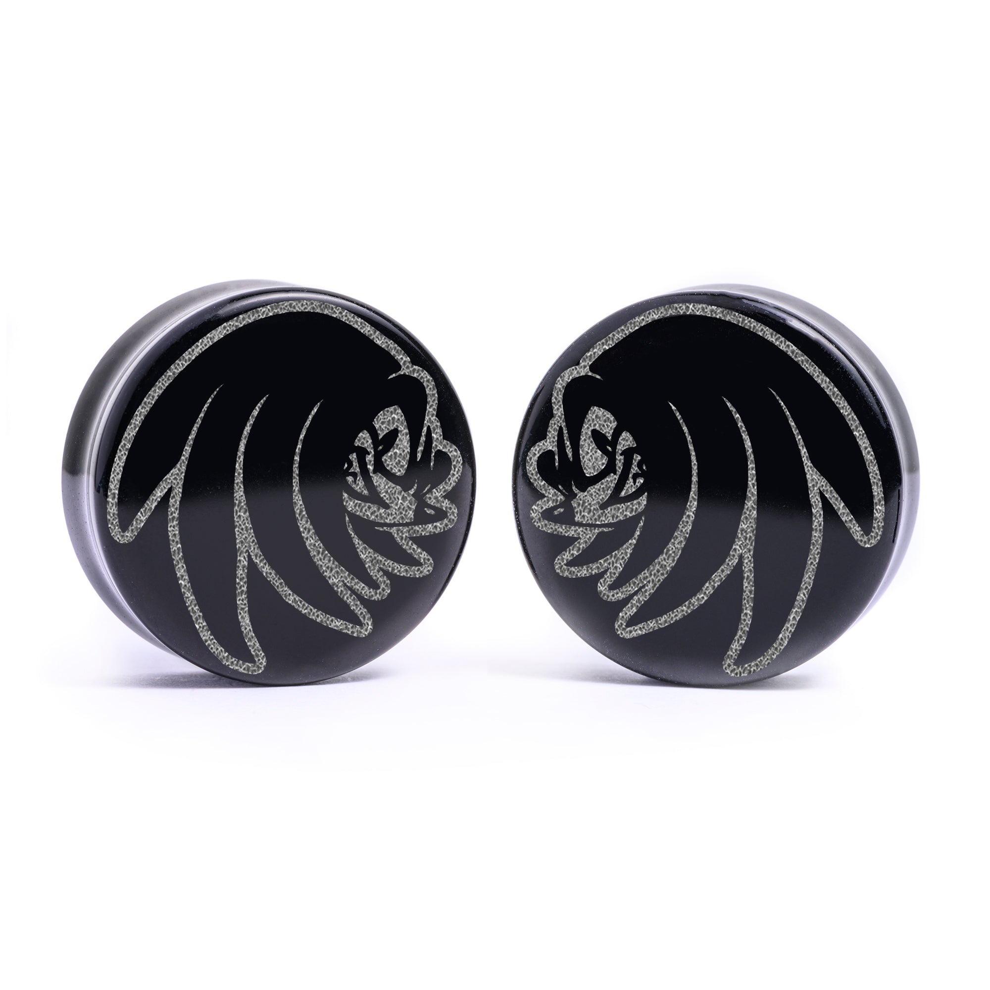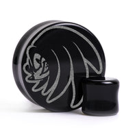 Flat Faced Doubleflared Black Glass Plugs featuring laser engraved "Knuckles" design.