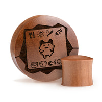 Convex Doubleflared Saba Wood Plugs featuring our laser engraved “Tamagotchi" design.