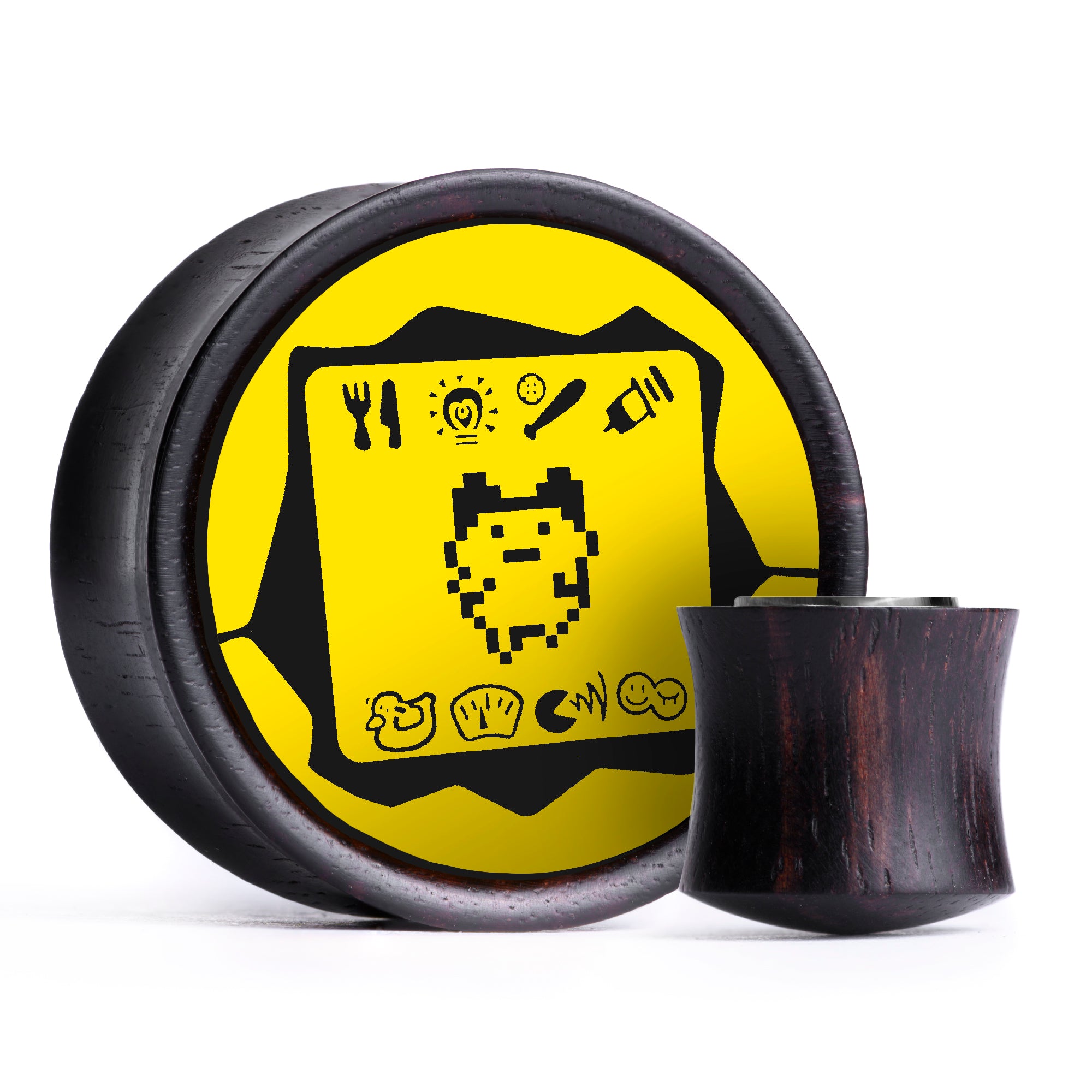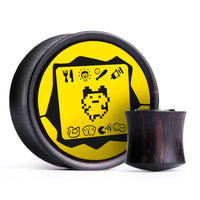 Limited Edition Double flared Ebony Yellow & Black Inlay Wood Plugs featuring the laser engraved "Tamagotchi"