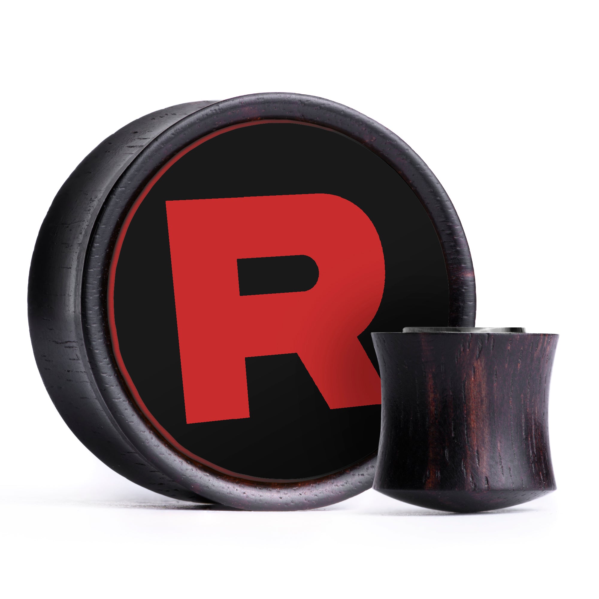 Limited Edition Double flared Ebony Black & Red Inlay Wood Plugs featuring the laser engraved Pokemon themed "Team Rocket"
