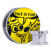 Limited Edition, High Quality Silver Steel Double flare Screw Back Yellow & Black Inlay Plugs featuring the laser engraved "This Is Fine"