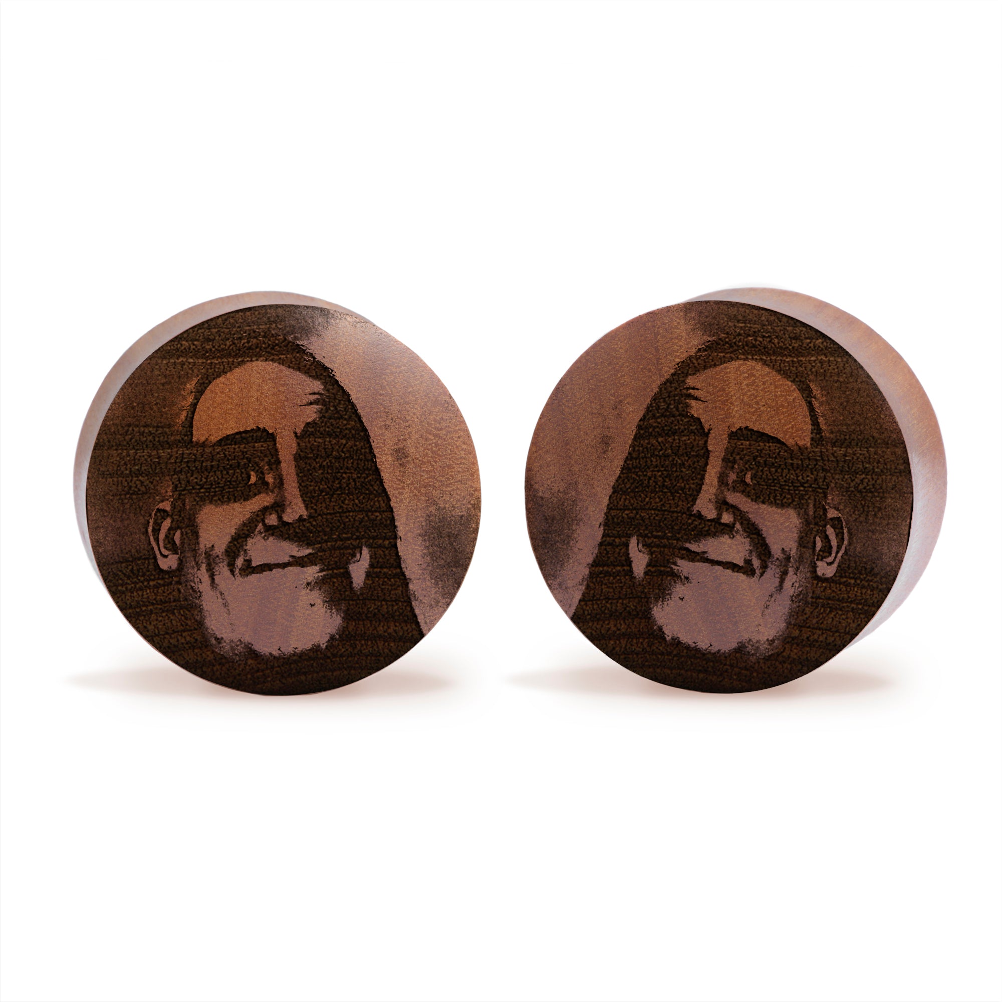 Convex Doubleflared Saba Wood Plugs featuring our laser engraved “Traumatised Mr Incredible" design.