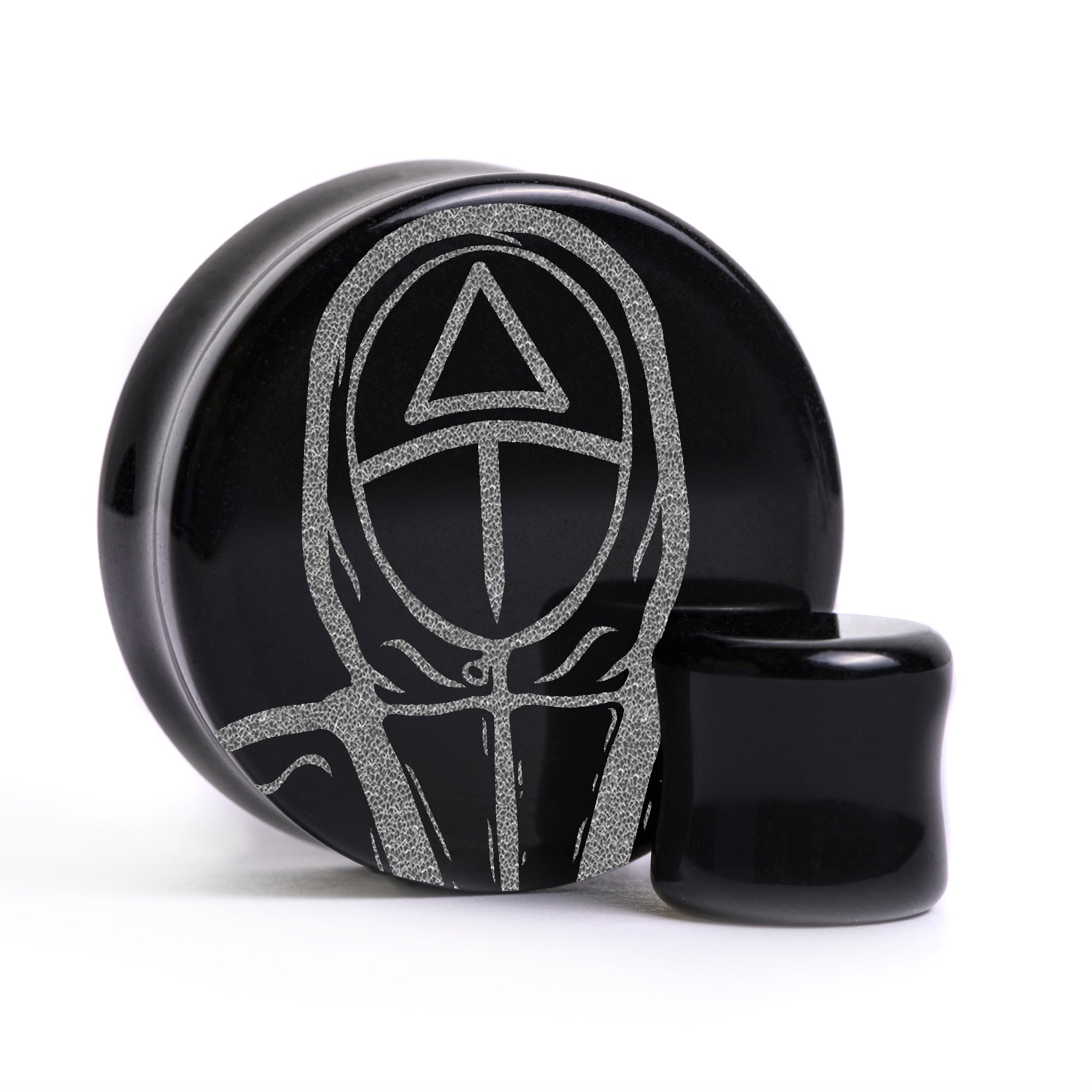Flat Faced Doubleflared Black Glass Plugs featuring laser engraved “Triangle Guard' design.