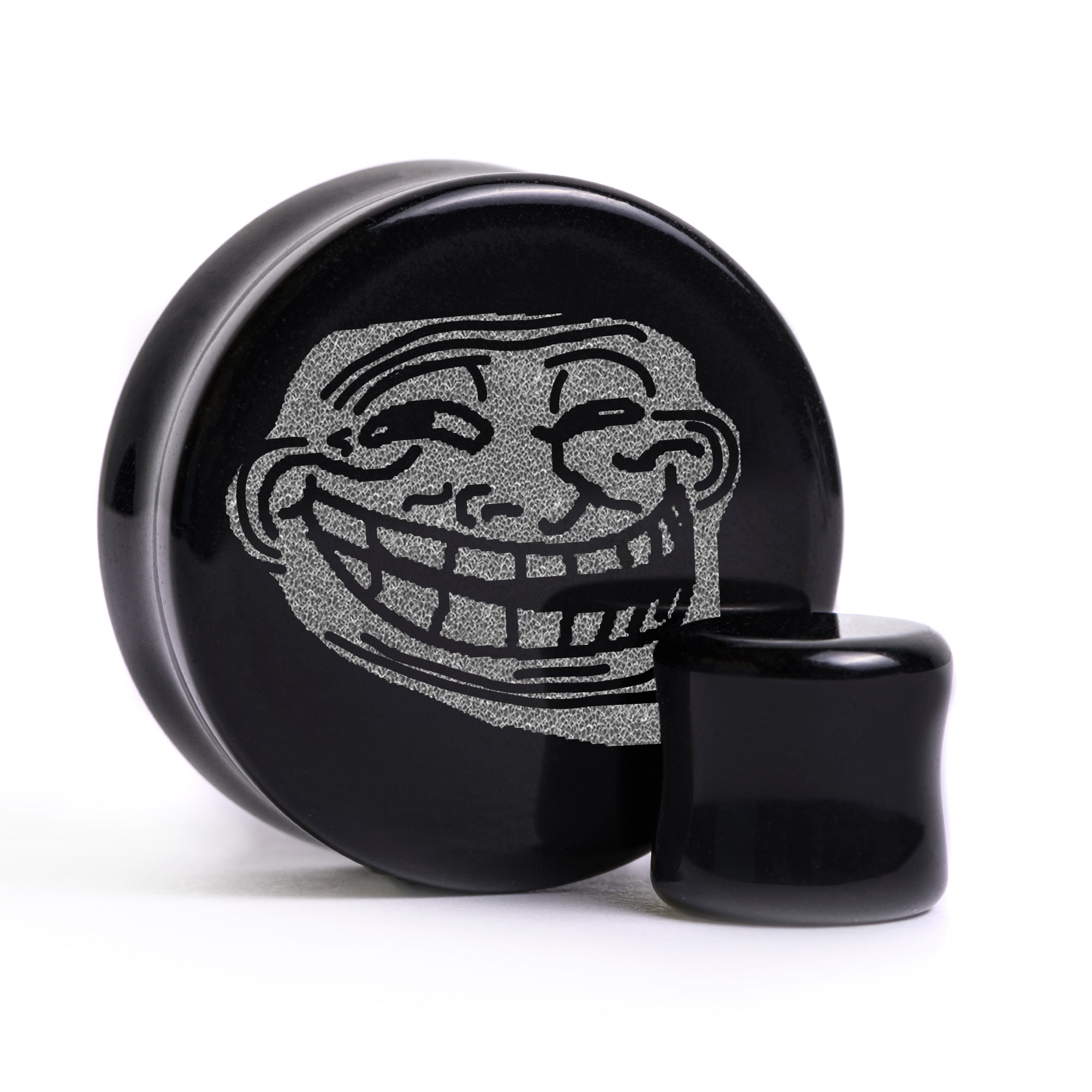 Flat Faced Doubleflared Black Glass Plugs featuring laser engraved "Troll Face" design.
