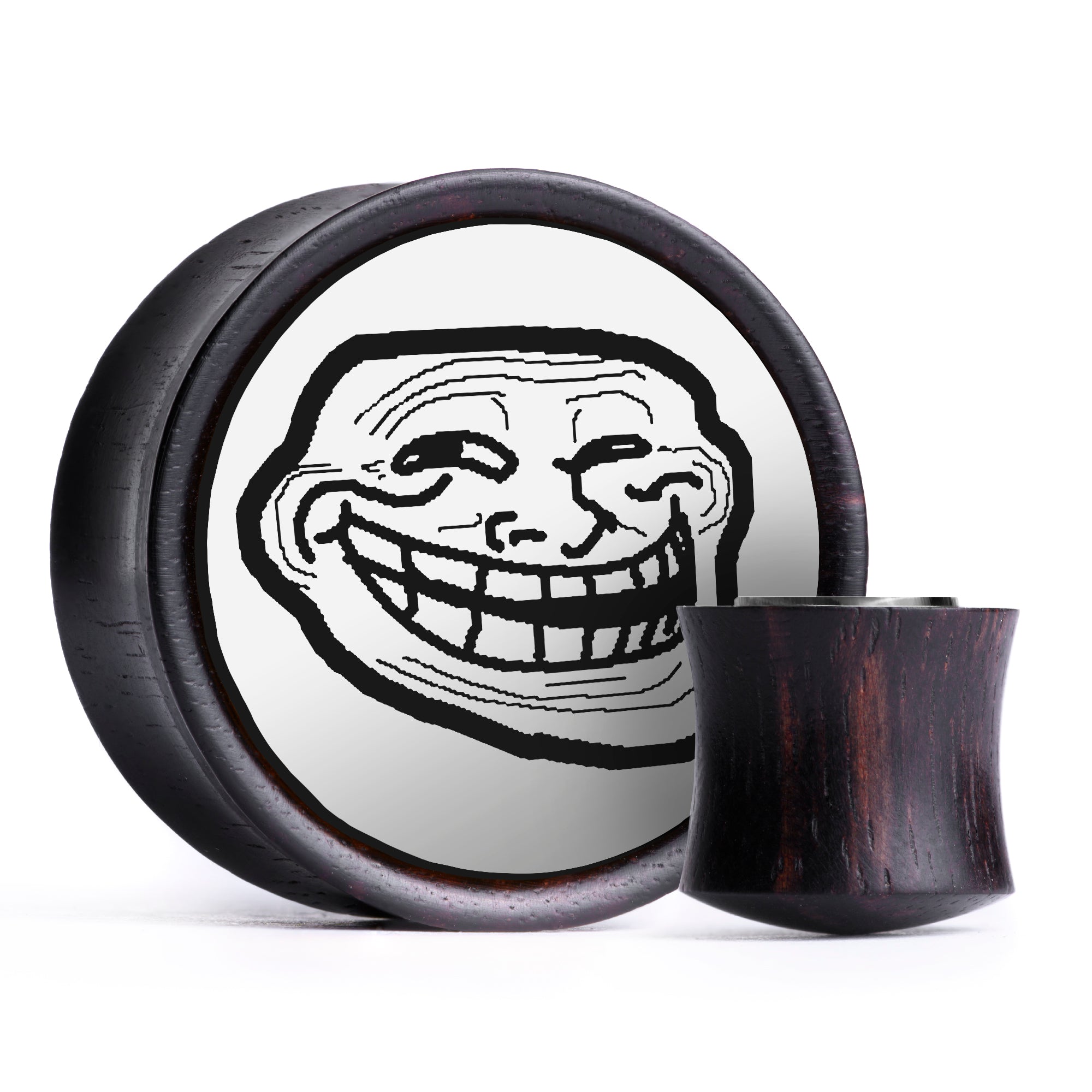 Limited Edition Double flared Ebony White & Black Inlay Wood Plugs featuring the laser engraved "Troll Face"