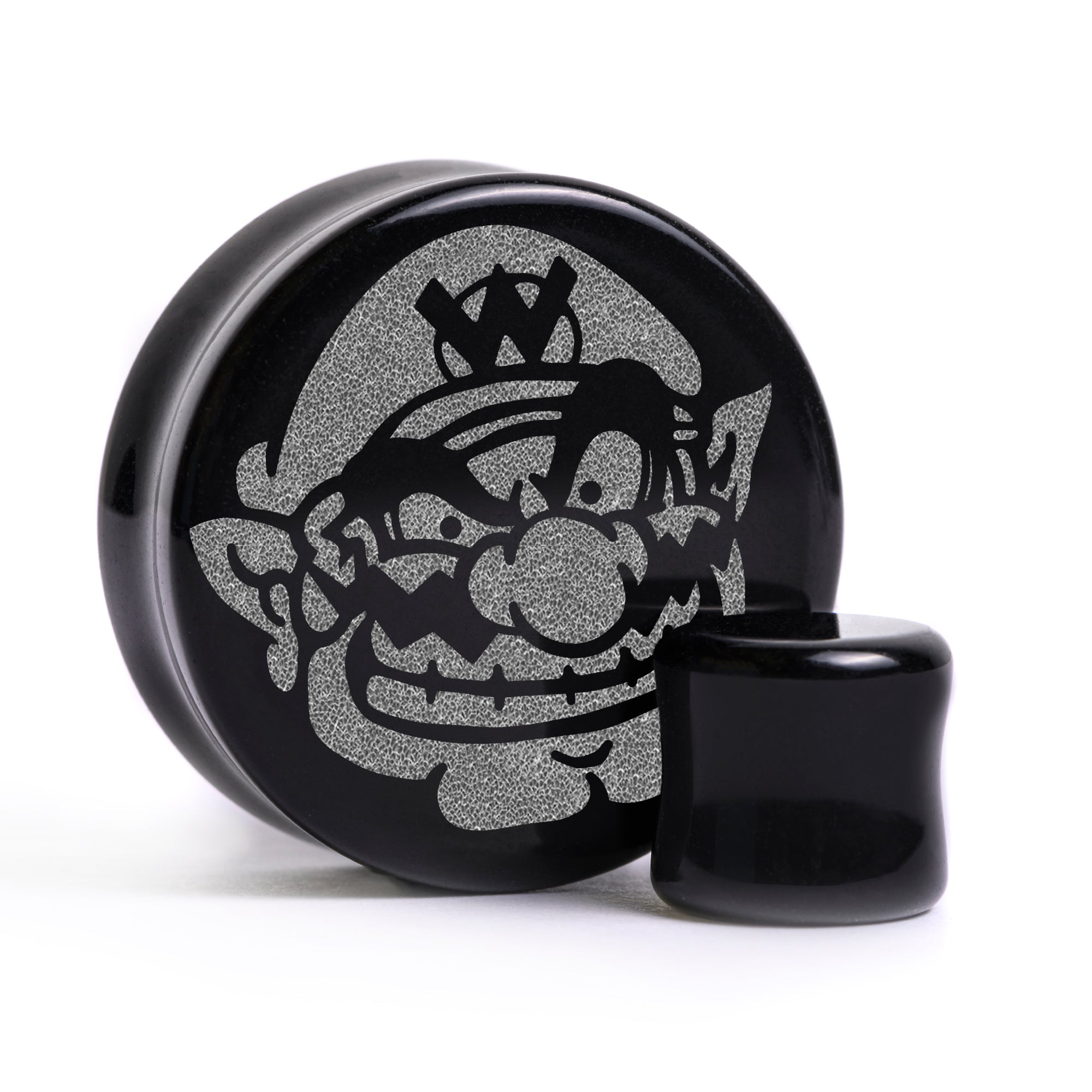 Flat Faced Doubleflared Black Glass Plugs featuring laser engraved "Wario" design.