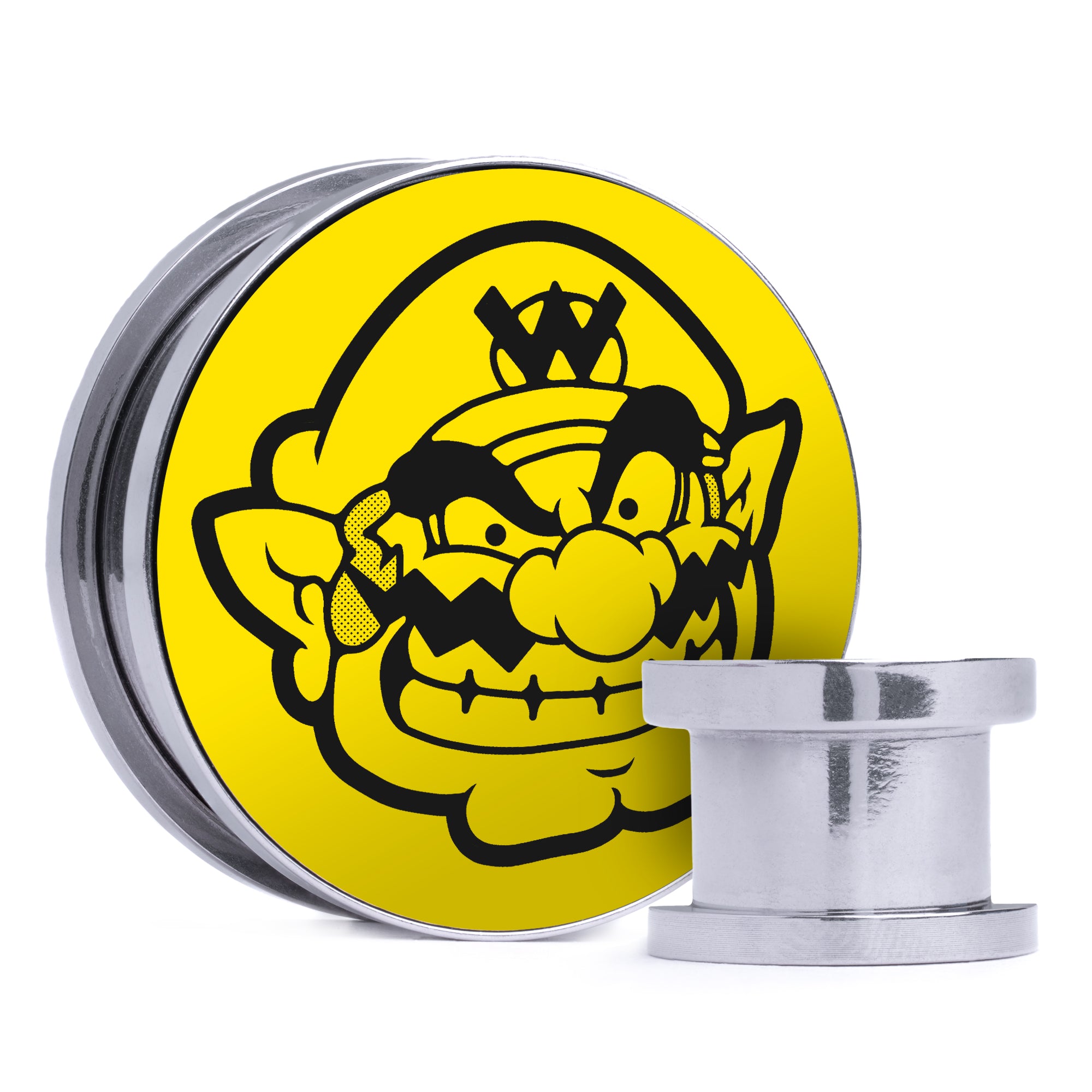 Limited Edition, High Quality Silver Steel Double flare Screw Back Yellow & Black Inlay Plugs featuring the laser engraved "Wario"