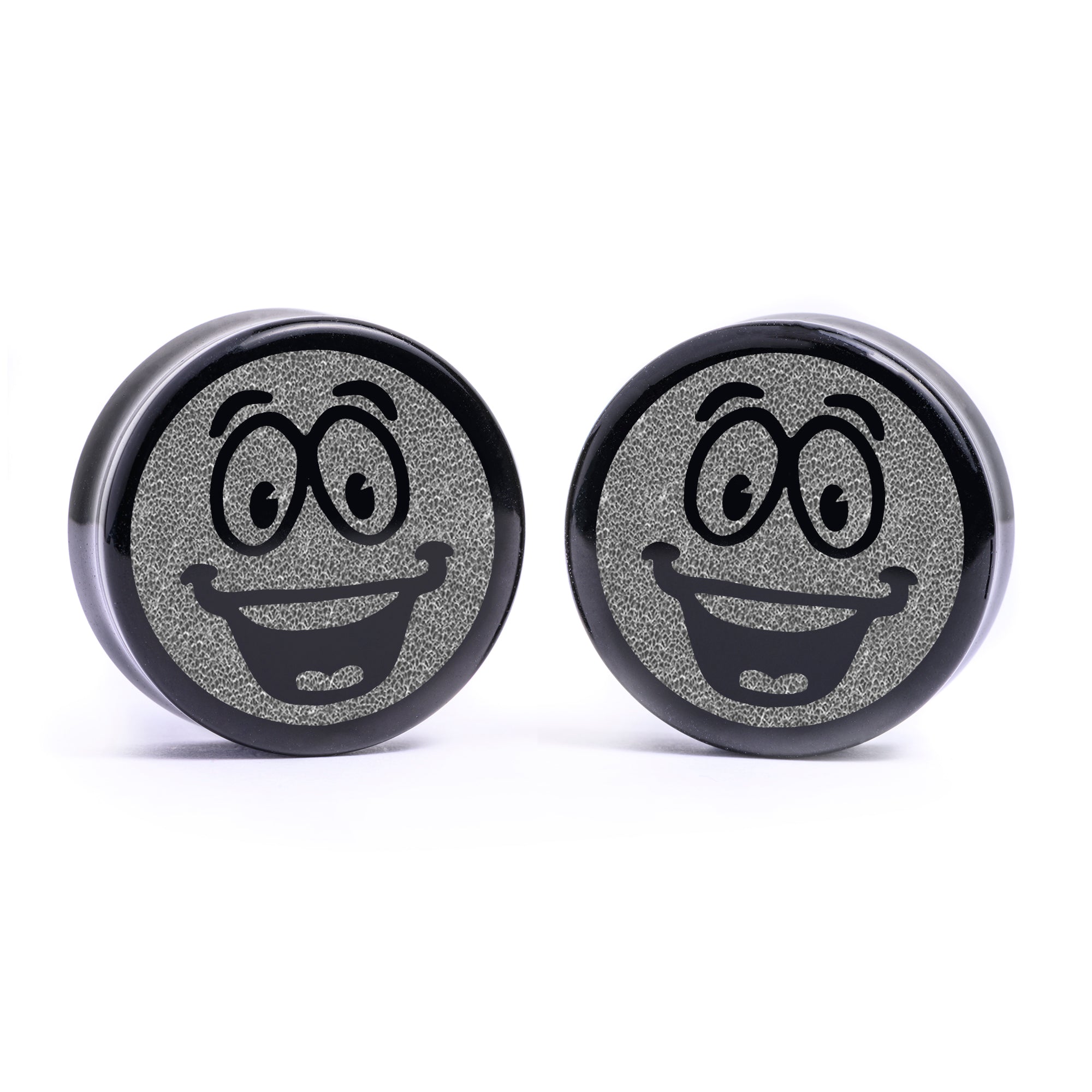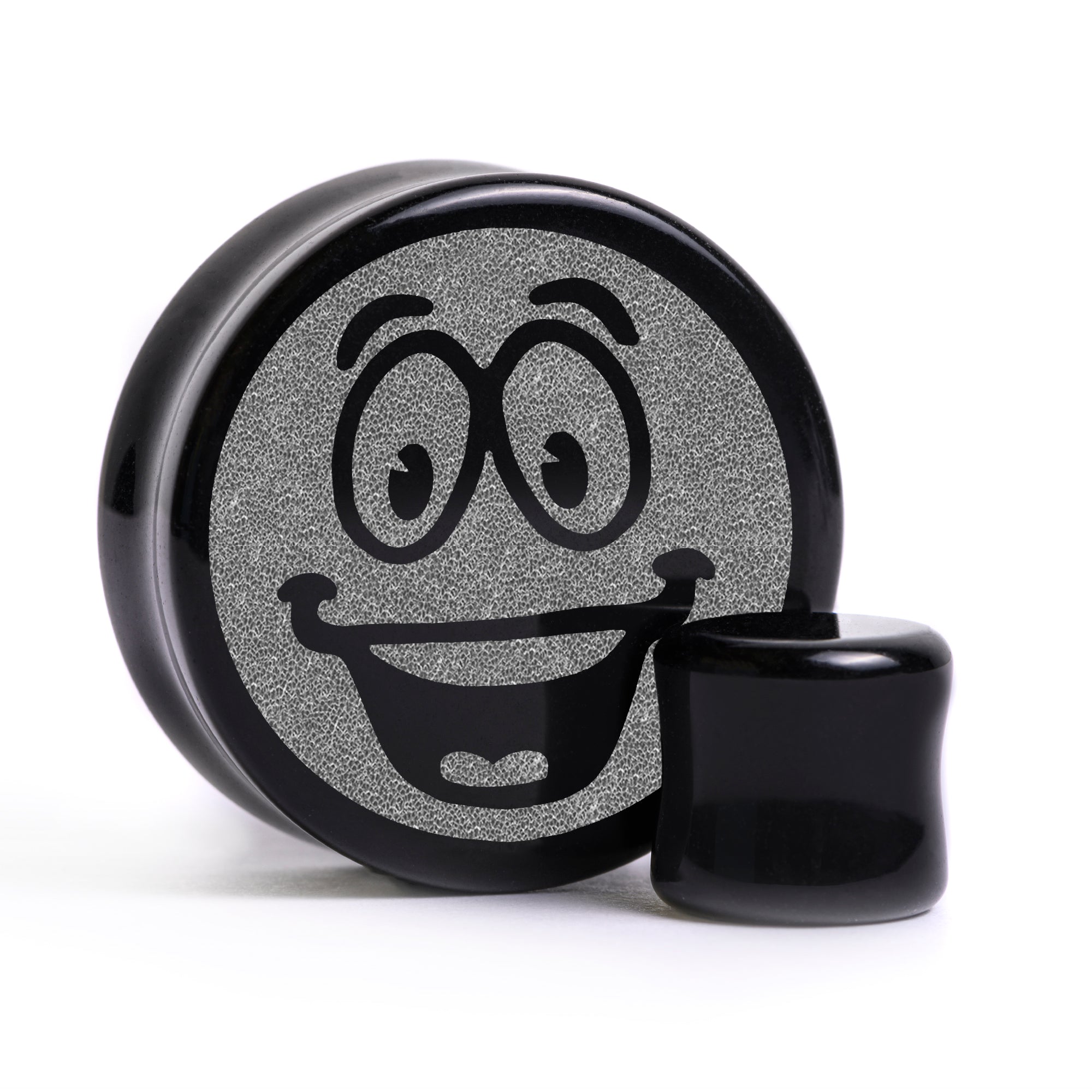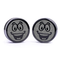 Flat Faced Doubleflared Black Glass Plugs featuring laser engraved "Yes Man" design.