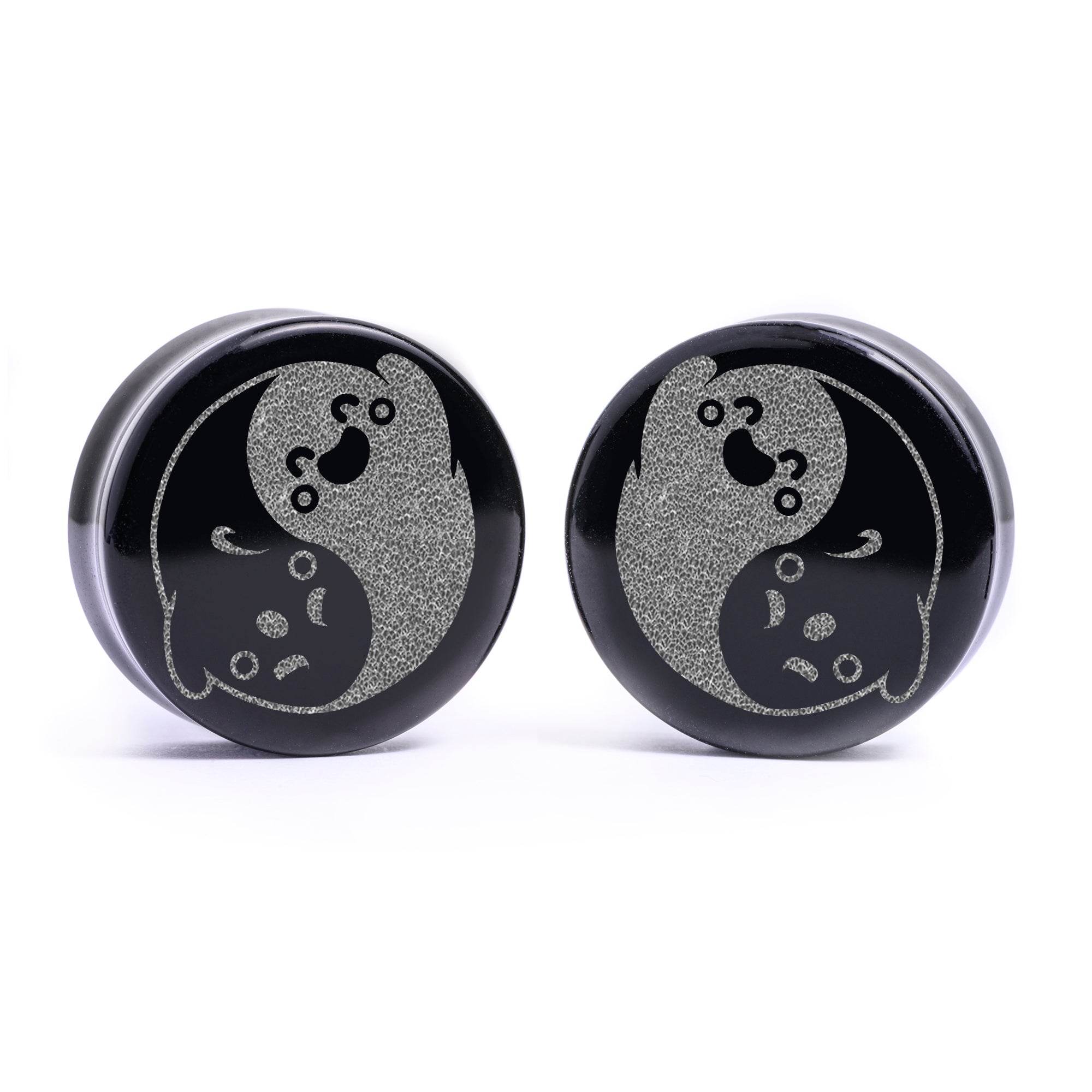 Limted Edition Flat Faced Doubleflared Black Glass Plugs featuring our laser engraved “Yin-Yang Ghosts" design. This product is part of our Halloween Promotion
