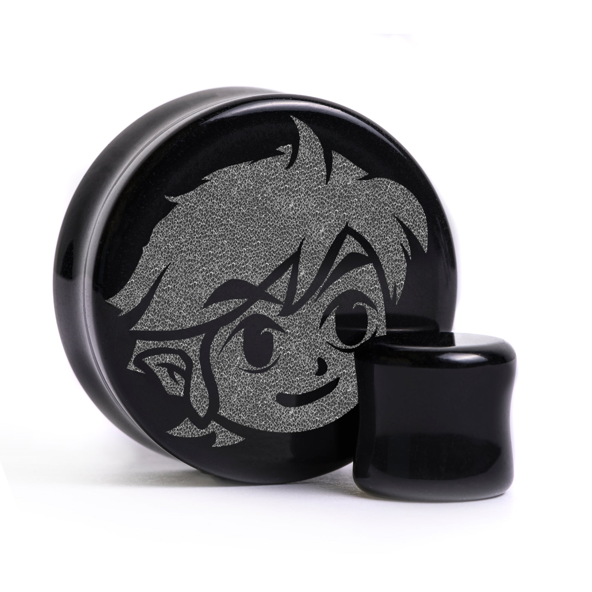 Flat Faced Doubleflared Black Glass Plugs featuring our limited edition laser engraved “TOON LINK" design.